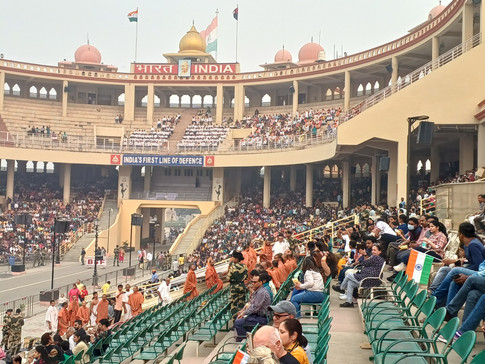 Every day – at dawn, when it opens, and at dusk, when it closes – crowds are welcomed at the Wagah Indo-Pakistani border post in Punjab to witness the raising and lowering of the flag ceremonies. On both sides, thousands of spectators come to cheer their peacock-crested soldiers on, wave flags, and sing along to hymns and anthems blaring through saturated sound systems.